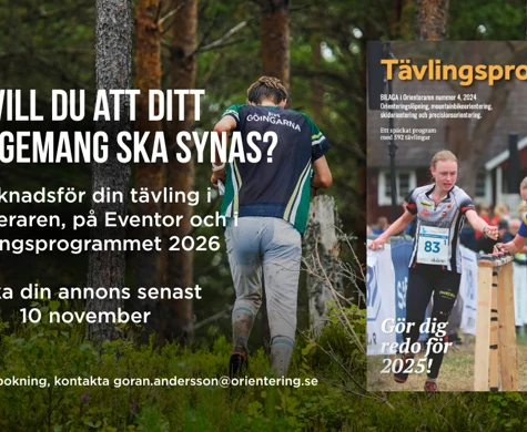 Som bilaga till Orienteraren nummer 4 2025 kommer Tävlingsprogrammet 2026 sedvanligt som bilaga. Alla arrangörer har nu chansen att marknadsföra sina event genom annons i såväl Orienteraren, Tävlingsprogrammet som på Eventor. Sista dag för bokning är 10 november.
