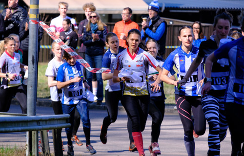 I damklassen blev det desto jämnare trots att Södertälje-Nykvarn OF gick ut drygt tre minuter före IFK på den sista sträckan. Världsmästarinnan Simona Aebersold plockade dock in meter för meter och kunde sekundvinna i en spännande slutuppgörelse.
