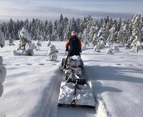 Bildtext: Spåren dras upp med skoter i Bullmark utanför Umeå. Fotograf Cecilia Rydberg.
