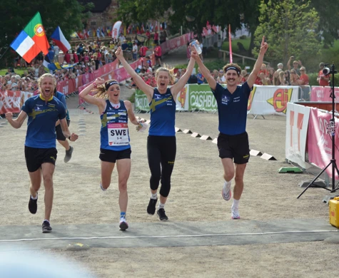 Övre bild: Gustav Bergman, Tove Alexandersson, Lina Strand och Max Peter Bejmer springer i mål på VM 2022. Foto: Tilda AnderssonText: Hugo Mattsson